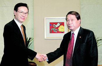 柳明桓(ユ・ミョンファン)外交通商部第1次官(右側)と、谷内正太郎・日本外務省事務次官が21日、ソウル鍾路区(チョンノグ)の外交通商部庁舍で、韓日外務次官協議に先立って握手を交わしている。