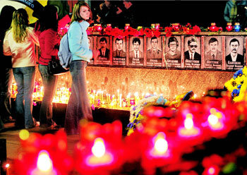 26日は、史上最悪の原子力発電所事故である旧ソ連(現ウクライナ)のチェルノブイリ原発事故が発生して20年。あの日の悪夢は20年が過ぎた今も、癒えない傷として残っている。同日、ウクライナのスルラブチチの追悼施設前には、事故当時、消火中に犠牲になった消防署員たちの写真がかけられていた。