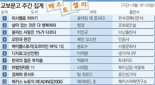 小説以外では、唯一、法頂和尚の箴言集『生きているものはすべて幸せであれ』が上位に入り、李鏜圭(イ・ミンギュ)教授の対人知能啓発書『惹かれる人は1%が違う』も急浮上している。販売部数がそれぞれ20万部と30万部を上回った。