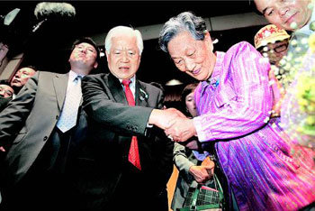 北朝鮮拉致被害者の横田めぐみさんの父親の滋さんが16日、ソウル松坡区(ソンパグ)にある水産協同組合中央会の講堂でめぐみさんの夫の金ヨンナムさんの母親のチェ・ゲウォルさんと一緒に記者会見を終えた後、手を握って歩いている。