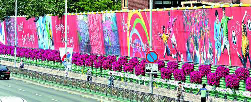 サッカー韓国代表チームの勝利を祈る国内最長、長さ170mの応援壁画が29日、ソウル城東区杏堂洞(ソンドング・ヘンダンドン)の杏堂小学校の壁面に貼り付けられた。選手たちが力強く競技する場面と、市民たちが熱烈に応援する姿が描かれている。壁画の前に列をなして差し立てられた小型太極(テグク)旗には、神話再現を望む市民たちの念願がこめられている。