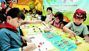 10日、ソウル市江南区駅三洞(カンナムグ・ヨクサムドン)のGS江南(カンナム)タワーで開かれたW杯勝利祈願イベントに参加した子供たちが、「がんばれ、太極(テグク)戦士」をテーマに絵を描いている。このイベントはGSグループが韓国代表選手たちの善戦を祈願するために開いた。