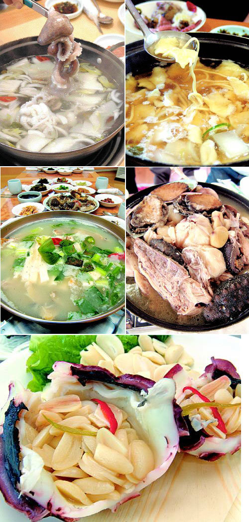 タコ料理の泰安バージョンは「フクベの中身とタコ汁」や「ミルグクタコ」だ。今は、タコが卵を生んで1年の短い生を終える産卵期。同時に、細足タコのシーズンが始まる。フクベの中のタコは、フクベの中身で出汁を作った後、それにタコを入れて沸かしたヨンポタン。そのさっぱりした味は一生忘れられないぐらいだ。フクベの中身とタコとの絶妙な出会い。半島泰安でなかったら可能でなかったはずだ。