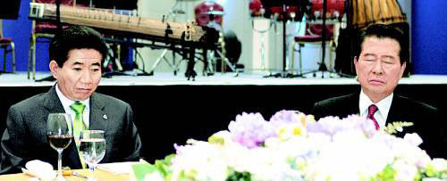 16日、光州(クァンジュ)の金大中(キム・デジュン)コンベンションセンターで行われた「ノーベル平和賞受賞者サミット」の昼食会で盧武鉉(ノ・ムヒョン)大統領(左側)と金前大統領が並んで座っている。盧大統領はあいさつの言葉で「今月末に予定された金前大統領の訪朝が南北関係をさらに進展させる良い契機になるだろう」と述べた。昨年、南北共同宣言5周年記念の国際学術会議以降1年ぶりに再会した2人は、簡単なあいさつの言葉を交わしたが、懸案に関する対話はしなかった。この日の行事には、ゴルバチョフ旧ソ連大統領などノーベル平和賞受賞者ら13人をはじめとする約700人が出席した。