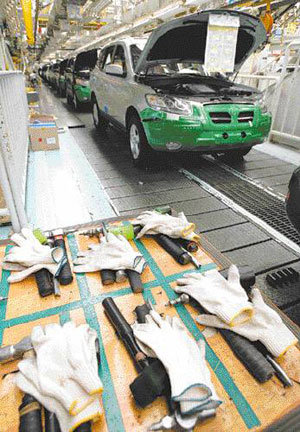 現代(ヒョンデ)自動車労組が部分ストに入った26日、蔚山(ウルサン)工場の生産ラインに、組合員たちがはずした軍手が置かれている。同社によると、同日のストライキによる売り上げの損失は360億ウォン。現代車労組は、1987年の労組設立以来、今年までの20年間、1年(1994年)を除いて、19年もの間ストを行った。
