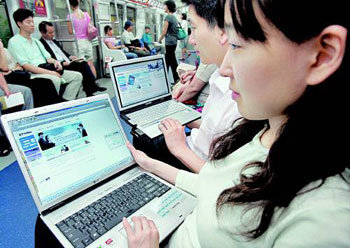 KT職員たちが、世界初の携帯インターネット(ワイブロ)の商用サービス前日の29日、地下鉄盆唐(プンダン)線で、サービスを試演している。KTとSKテレコムは、移動中にも超高速インターネットが利用できるワイブロの常用サービスを30日から開始する。サービスを利用するには、27万〜30万ウォン台前半価格の専用カードを購入しなければならない。料金は、定額制基準月1万6000〜3万ウォン。