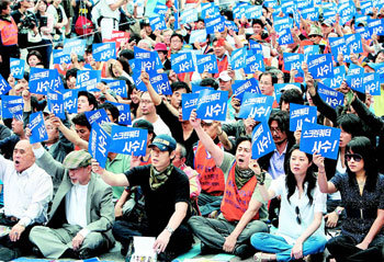 1日、ソウル鍾路区大学路(チョンノグ・テハンノ)で開かれたスクリーン・クォーター縮小反対デモに参加した映画界関係者たちは、盧武鉉(ノ・ムヒョン)大統領に、「国の心配はやめて、故郷に戻ってください」と、批判の声を高めた。政権初期には友好的だった映画界と参加型政府の関係は、スクリーン・クォーター縮小施行を機に、決定的にひびが入った。