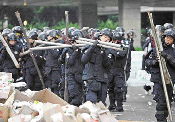 15日の明け方、慶尚北道浦項市南区(キョンサンプクド・ポハンシ・ナムク)のクェドン洞にあるポスコ本社に進入した警察官たちが、そこを占拠している浦項地域の建設労組員たちの放置した鉄パイプを収去している。建設労組員たちは16日、ポスコ本社の4〜12階で占拠座り込みを続けた。