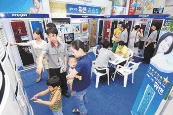 本格的な暑さが始まり、エアコンが飛ぶように売れている。3日、ソウル冠岳区奉天洞(クァナクク・ポンチョンドン)のLG電子ハイプラザの売場で、ショッピングに来た家族がエアコンを選んでいる。