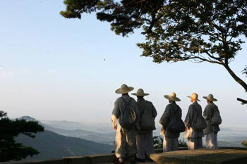 「悟りを開き、これから漫行します」。8日、忠清南道禮山郡(チュンチョンナムド・イェサングン)にある修徳寺内の定慧寺の能仁禅院で、夏季集中修行である夏安居を終えた僧侶たちが、山門を出る前にしばらく足をとめ、世間を見下ろしている。3ヵ月間の夏安居には、全国94の禅院から2319人の僧侶が参加した。