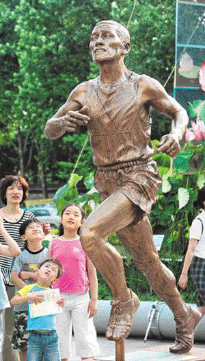 1936年ベルリン五輪マラソン制覇70周年を記念した故・孫基禎(ソン・ギチョン)さんの銅像が9日、ソウル市庁前のソウル広場に姿を現した。渾身の力を尽くして堂堂とゴールに入ってくる孫さんの姿から、日本植民地時代に民族の誇りを目覚めさせてくれた彼の意思と魂を感じることができる。