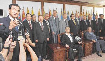 歴代の国防長官17人と将軍出身の軍元老10人が、ソウル松坡区新川洞(ソンパグ・シンチョンドン)の在郷軍人会館で、現政権の戦時作戦統制権の還収推進と関連した声明書を発表した後、尹昌老(ユン・チャンノ)予備役准将(左)が記者たちの質問に答えている。