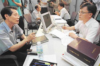監査院が21日、成人向けの賭博ゲーム「海の物語」疑惑と関連し、文化観光部に対する監査に入った。監査院の職員(右側)がソウル鍾路区世宗路(チョンログ・セジョンロ)の文化部庁舎で文化部の職員を相手に、海の物語の許認可過程などに対する調査を行っている。