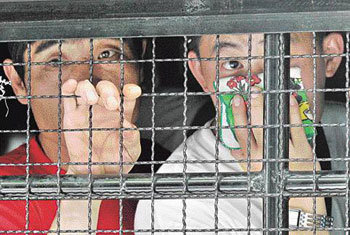 タイ入管当局に不法入国罪で拘束された脱北者たちが24日、パトカーに乗せられてバンコク北部の裁判所に向かっている。脱北者175人のうち、国連難民高等弁務官事務所(UNHCR)が発行した旅行証明書の所持者16人を除く159人が、法廷に送られた。UNHCRで難民と認められた16人は25日、バンコクを出発して韓国に向かった。UNHCRは、残りの脱北者たちもすぐに韓国へ行くことになると明らかにした。