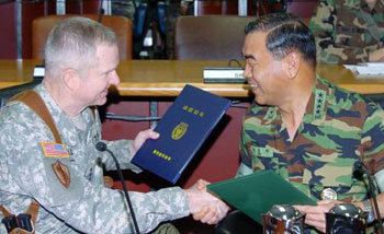 30日、ソウル近くの地下バンカーで李相憙(イ・サンヒ)合同参謀議長(右側)とベル在韓米軍司令官が、在韓米軍が受け持ってきた韓半島中部地域の近接航空支援(CAS)統制任務を、31日から韓国軍に委譲する合意書に署名した後握手している。CAS任務は03年11月、韓米合意に従って韓国軍が在韓米軍から委譲することになった10大軍事任務の一つだ。