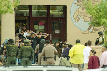 6日、米アリゾナ州ナバホインディアン保護区域のある高校で、生徒らが投降するように警察側に歩いて出ている。学校の中で銃器を見たという届け出で警察が学校を封鎖して、捜索作戦を展開したために可能となった光景だ。生徒と警察の間で衝突や容疑者の逮捕もなかったという。