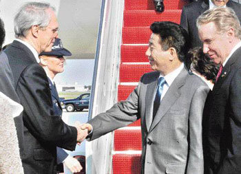 盧武鉉(ノ・ムヒョン)大統領が、米国公式訪問のために、12日午後(現地時間)、ワシントンのアンドリュース空軍基地に到着し、クリストファー・ヒル米国務次官補(東アジア太平洋担当)の出迎えを受け、握手を交わしている。