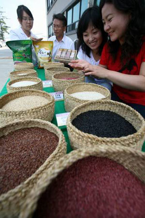 農村進興庁の研究員らが23日、京畿道水原市勧善区(キョンギド・スウォンシ・クォンソング)の作物科学院で、自ら開発した新品種の米を細かくチェック。農業振興庁はダイエット効果や、コレステロール減少に効果のある成分を含む赤色、黒色など、多様なカラーの機能性米を開発した。