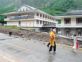 中国政府から21日、一方的な撤去通知を受けた吉林天上温泉観光ホテル(代表=李テボン)の前を、先月、観光客たちが歩いている。白頭山(ペクトゥサン)北側の登山路に位置した同ホテルは、1993年に合作でオープンした。2003年に韓国人の独自運営に変わって2038年まで運営権が保障され、699万ドル(約66億ウォン)が投資された。