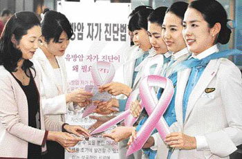 大韓(テハン)航空は29日から来月31日まで、女性乗客を対象で、乳癌予防のためのキャンペーンを実施する。仁川(インチョン)国際空港の出国場で、女性乗務員たちが乗客たちに、乳癌予防運動を象徴するピンクのリボンと乳癌自家診断マニュアルを配っている。