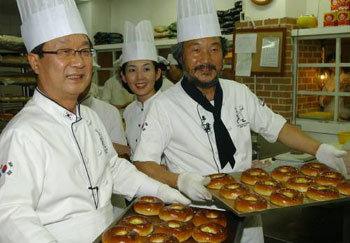 「100日民心大長征」の94日目を迎えた孫鶴圭(ソン・ハクギュ)前京畿道(キョンギド)知事が1日、大田中区銀杏洞(デジョン・チュング・ウンヘンドン)の菓子屋「ソンシムダン」の前で、焼きたてのパンを手にしている。姜在渉(カン・ジェソプ)ハンナラ党代表は同日、孫前知事の民心大長征の現場を訪れて励ました。