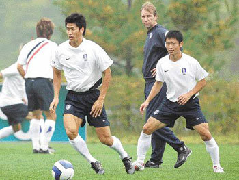 설기현이 오른쪽 최전방 공격수, 이영표가 왼쪽 수비수로 자리를 잡고 선수들을 리드했다.