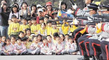 18日、忠清南道鶏龍台(チュンチョンナムド・ケリョンデ)の飛翔滑走路で開かれた韓国最大の軍の祝祭である「地上軍フェスティバル・ディフェンスアジア2006」の会場に足を運んだ観覧客が、儀仗隊の一糸乱れぬ銃剣術を見て感嘆している。