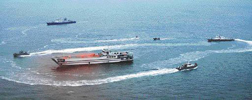 北朝鮮の核実験後、大量破壊兵器拡散防止構想(PSI)による船舶検査に対し、国際社会の関心が高まっている中、26日、全羅南道木浦(チョンラナムド・モクポ)のシンウェ港の沖合いで、木浦海警と陸軍など7機関が、合同でテロ犯に拿捕(だほ)された船舶を救出する鎮圧作戦の訓練をしている。