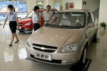 中国上海のある外車の販売場で、顧客と販売員が米国のゼネラル・モータース(GM)の新車を前にして商談している。急激な輸出増大で外貨はなかれ込み、高級外車などの高価品を求めている中国人顧客の要求も日々大きくなっている。中国はGMの一番大きな海外市場で、今年3四半期まで64万5680台が売れた。
