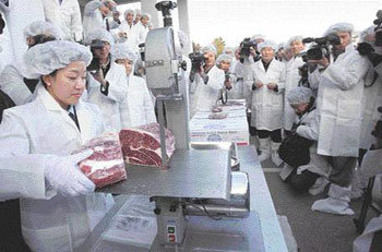 16日午後、農林部傘下の国立獣医科学検疫院・仁川支院で、研究員たちが米国産輸入牛肉の切断検査過程を報道陣に公開した。しかし、検査過程のメディア公開は、米国産牛肉輸入に反対する生産者と消費者団体が激しく抗議し、大声が飛び交いもみあう場面もみられた。