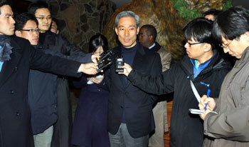 韓米自由貿易協定(FTA)第5回目の交渉に出席するため、米モンタナ州ビックスカイ・リゾートに到着した金宗壎(キム・チョンフン)韓国交渉団の主席代表が3日、記者の質問に答えている。