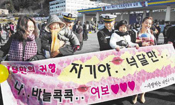 21日慶尚南道鎭海市(キョンサンナムド・チンへ)の海軍士官学校の練兵場で開かれた「06海軍巡航訓練艦隊の帰港式」で出迎えにきた訓練教官の妻たちが、114日ぶりにあう夫と共に、アイデアあふれるプランカードを見せながら笑っている。