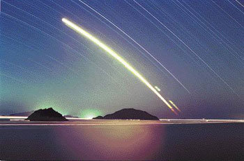 多事多難だった2006年が沈む太陽の軌跡とともに暮れ、沖合いの夜空を照らす星の軌跡は、近づく新年の希望と期待をうかがわせる。慶尚南道巨済市南部面大浦里(キョンサンナムド・コジェシ・ナムブミョン・テポリ)のホンポ村の沖合で、25日午後2時30分から3時間、太陽の軌跡をダイアフラムF22.ND1millionフィルターを使って撮影し、午後6時30分から、ダイアフラムF11で月の軌跡の一部を、26日0時から午前6時まで、ダイアフラムF11で星の軌跡を三重撮影した。