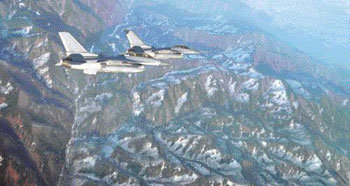 年の瀬、海抜7000フィート(約2500メートル)の上空で見下ろした祖国の山河は、目が痛いほど美しかった。本紙のユン・サンホ記者が乗り込んだ空軍KF—16戦闘機と同じ機種の戦闘機が白頭山脈の上を飛んでいる。戦闘機編隊は時速800キロで飛行しながら、東海地域の哨戒飛行の任務を随行した。