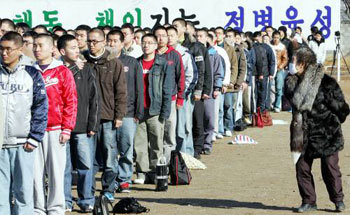8日、忠南論山(チュンナム・ノンサン)の訓練所で行われた入営式で、あるお婆さんが堵列している孫を訪ねて、練兵場まで降りてきて励ましている。軍当局と兵務庁は、政府の軍服務期間の短縮方針の発表で、入営対象者の入所の延期が多いことを懸念したが、入所延期者はほとんどない状態だ。