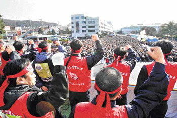 現代(ヒョンデ)自動車労組が部分ストに突入した15日昼、蔚山(ウルサン)工場の本館前で開かれたスト宣言式で、労組員4000人あまりが指導部の指揮に従って、ストの決意を固める掛け声を叫んでいる。