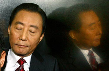 16일 대선 불출마 선언을 하기 위해 기자회견장인 서울 종로구 연지동 여전도회관 14층에 엘리베이터를 타고 올라온 고건 전 국무총리가 지지자들이 내리지 못하게 막자 착잡한 듯 눈을 감고 있다.