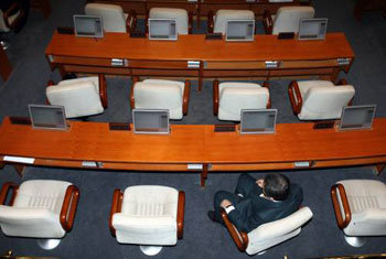 ソウル南部地方裁判所がヨルリン・ウリ党の党憲法改正に対する執行停止決断を下した19日、ウリ党の金槿泰(キム・グンテ)議長が国会本会議場で一人で席に座って考えている。党内では事態にきちんと対処できなかったことに対して指導部が責任を負わなければならないという主張が提起されている。
