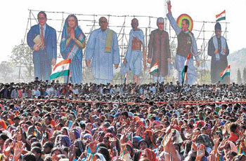 20日、インドで開かれた執権与党国民会議のソニア・ガンジー党首の政治集会に、インドの歴代政治指導者たちの大型絵が掲げられた。マハトマ・ガンジー(真ん中)とジャワハルラル・ネルー(左から五番目)の姿が目立つ。