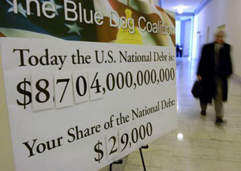 米国の負債規模を知らせる表示板がワシントン国会議事堂「キャノンハウスオフィス」ビルの廊下に置かれている。負債規模は総額8兆7040億ドル(約8126兆ウォン)、1人あたりの負債は約2万9000ドル(2700万ウォン)だ。