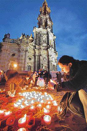 13日、ドイツのドレスデン市で、市民が第2次世界大戦の犠牲者を追悼するキャンドルに灯をともしている。62年前の1945年2月13日と14日の2日間行われた連合軍のドレスデン大空襲により、市民3万5000人余りが犠牲となった。