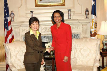 米国を訪問している朴槿恵(パク・グンへ)前ハンナラ党代表が、15日(現地時間)、米国務総省を訪問し、ライス長官と握手を交わしている。