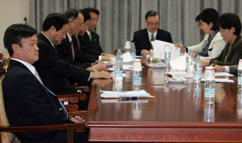 野党ハンナラ党の有力な大統領候補の一人である李明博(イ・ミョンバク)前ソウル市長の選挙法違反事件に関する資料を党に提出して李前市長の検証を要求し、波紋を投げかけた鄭寅鳳(チョン・インボン、左)弁護士が20日午後、国会議員会館で開かれた倫理委員会会議に出席し、固い表情で座っている。