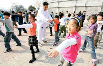 27日、国立民族博物館で「一緒に分け合う民族教室」が開かれた。韓国伝統の武芸のテッキョンを学ぶ生徒たちが姿勢を維持するのに苦労しながらも、笑いを堪えられない様子だ。