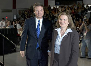 夫人の乳房がん再発にもかかわらず、大統領への挑戦を続ける意向を表明したエドワーズ元民主党上院議員と夫人のエリザベス女史。「家庭か野望か」の選択で、米国社会に論争の火をつけている。