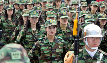 ソウル瑞草区(ソチョグ)の女性予備軍小隊員75人が29日午後、ソウル瑞草区役所の広場で開かれた創設式で厳肅な表情で列を成している。30〜50代の女性で構成された彼らは瑞草区内の良才(ヤンジェ)高校、新盤浦(シンバンポ)中学校、ウンナム高校の子母会と瑞草区のボランティア・センターなど4団体の会員で、これから毎年1回ずつサバイバル装備を活用した市街地での戦闘訓練と応急処置の訓練を受ける。