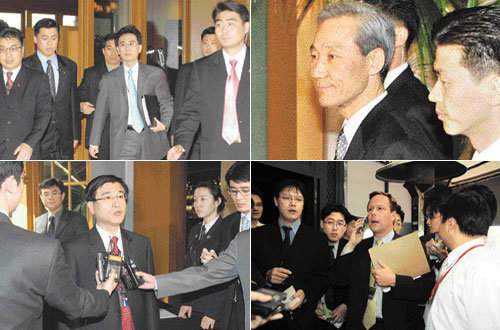 事実上、韓米自由貿易協定(FTA)交渉の最終日である30日、両国の交渉団は約10か月間の公式交渉期間中、もっとも忙しい一日を送った。左から金宗壎(キム・ジョンフン)韓国側交渉団首席代表、金鉉宗(キム・ヒョンジョン)通商交渉本部長、李恵民(イ・へミン)企画団長、スティーブン・ノータン米通商代表部(USTR)報道官。