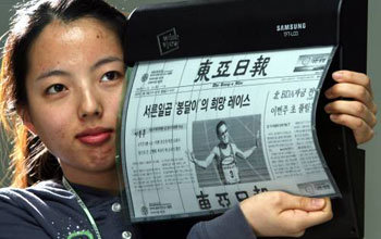 三星(サムソン)電子が開発している「ディスプレイ電子ペーパー(eペーパー)」に、東亜(トンア)日報の紙面が映される。同電子ペーパーは、液晶表示装置(LCD)やプラズマディスプレイパネル(PDP)と違い、ガラスの代わりにプラスチックを使用しており、曲げても割れない。