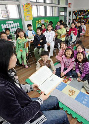 ソウル江北区(カンブクク)の水踰(スユ)小学校3年生が先月30日、読書の授業を受ける。水踰小学校は、読書指導のためのワークブック「青い心、白い心」を活用し、生徒が学年ごとに推奨図書約50冊を読んで、読後感と読書葉書きを書くよう指導している。