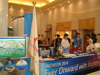 2014年アジア大会の仁川(インチョン)招致委員会の関係者たちが15日、クウェートシティーのマリオットホテル1階ロビーに設置された広報館で、最後の広報合戦に励んでいる。